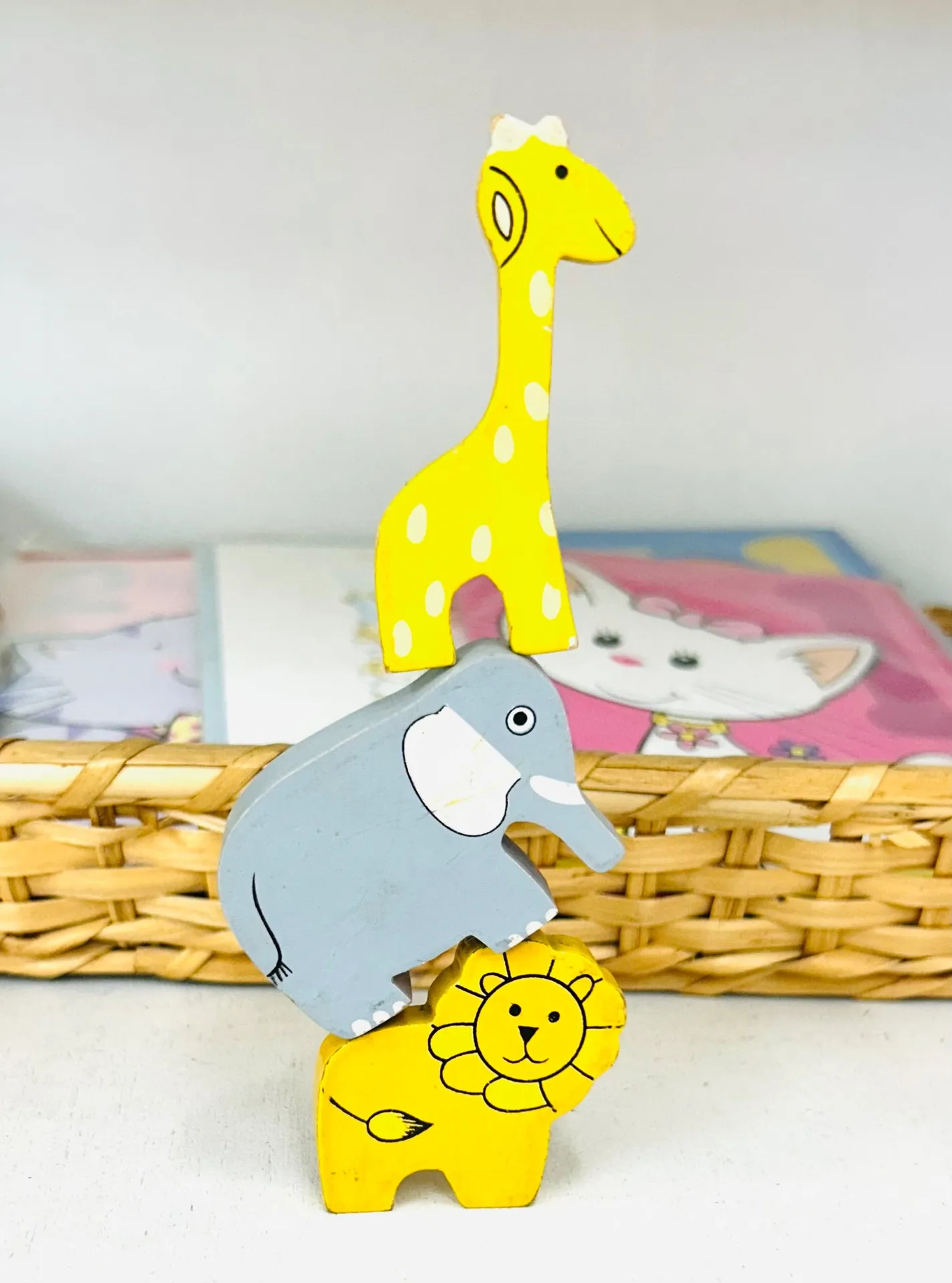 今日の画像は、生徒の誰かが、教室の備品の木の動物たちを上手に組み合わせて、ブレーメンの音楽隊のように積み上げているのを発見したので写真を撮ったものです。